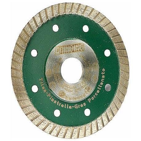 Disco diamantato con corona zigrinata continua di altezza 10 mm. La struttura con anima in acciaio ultrasottile e flangia rinforzata consente tagli molto veloci e precisi su gres porcellanato garantendo la massima sicurezza. Applicazione: Gres porcellanato, piastrelle dure, marmo, terracotta e granito. Diametro 115 mm, spessore 1,2 mm. Max 13300 giri/min. Foro da 22,2 mm.